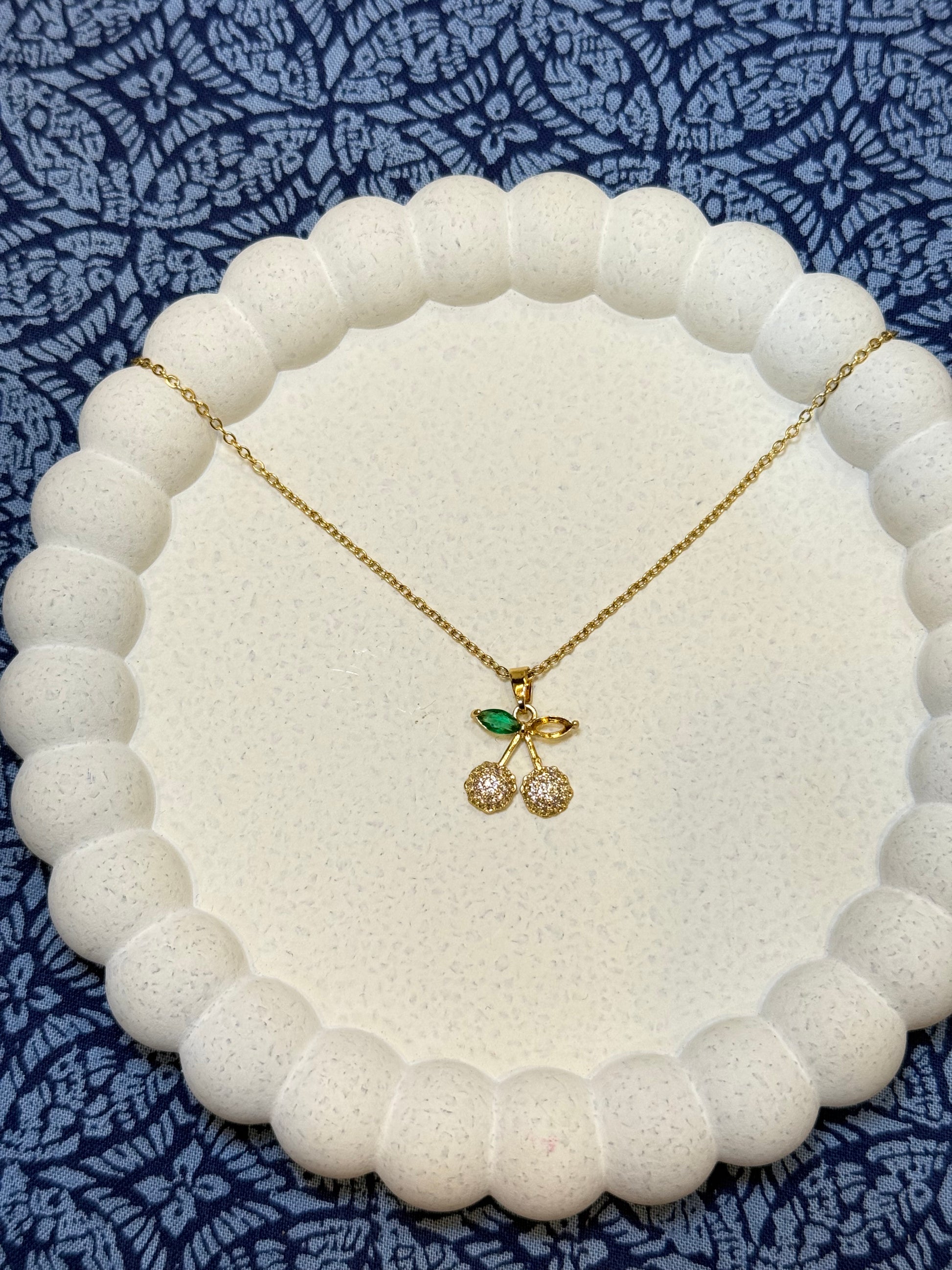 Upgrade your jewelry collection with our Emerald Cherry Necklace. Crafted from durable stainless steel, this twin cherry pendant features green leaf accents and sparkling crystals. With a one year guarantee, you can confidently wear this stylish piece with any outfit. Perfect for adding a touch of nature and elegance to your look.