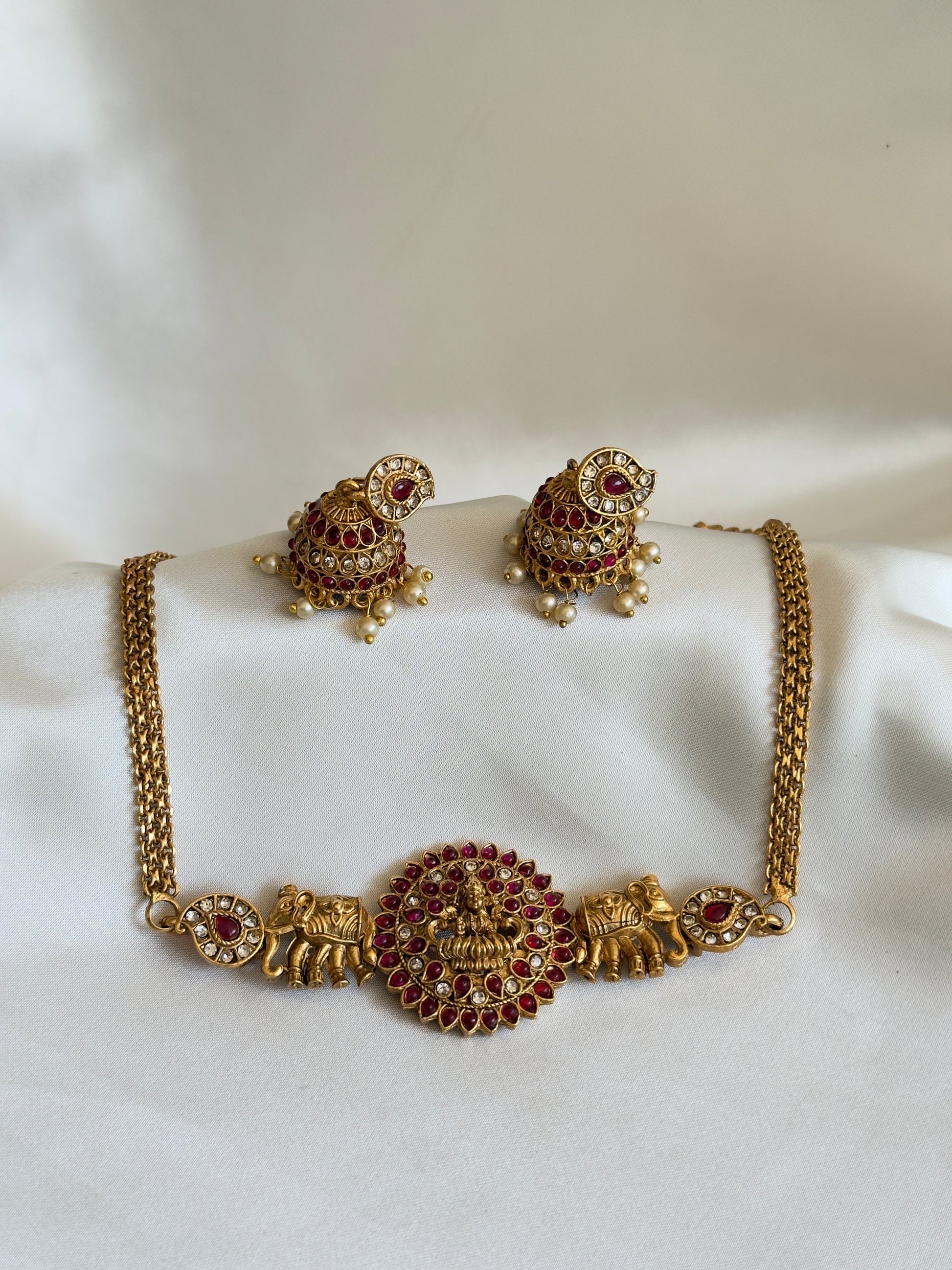 Introducing the Elephant Lakshmi Chocker Red, a stunning piece of jewelry featuring intricate elephant and Lakshmi designs. Made with high-quality materials, this chocker offers a touch of elegance and cultural significance to any outfit. Elevate your style with this beautiful chocker.