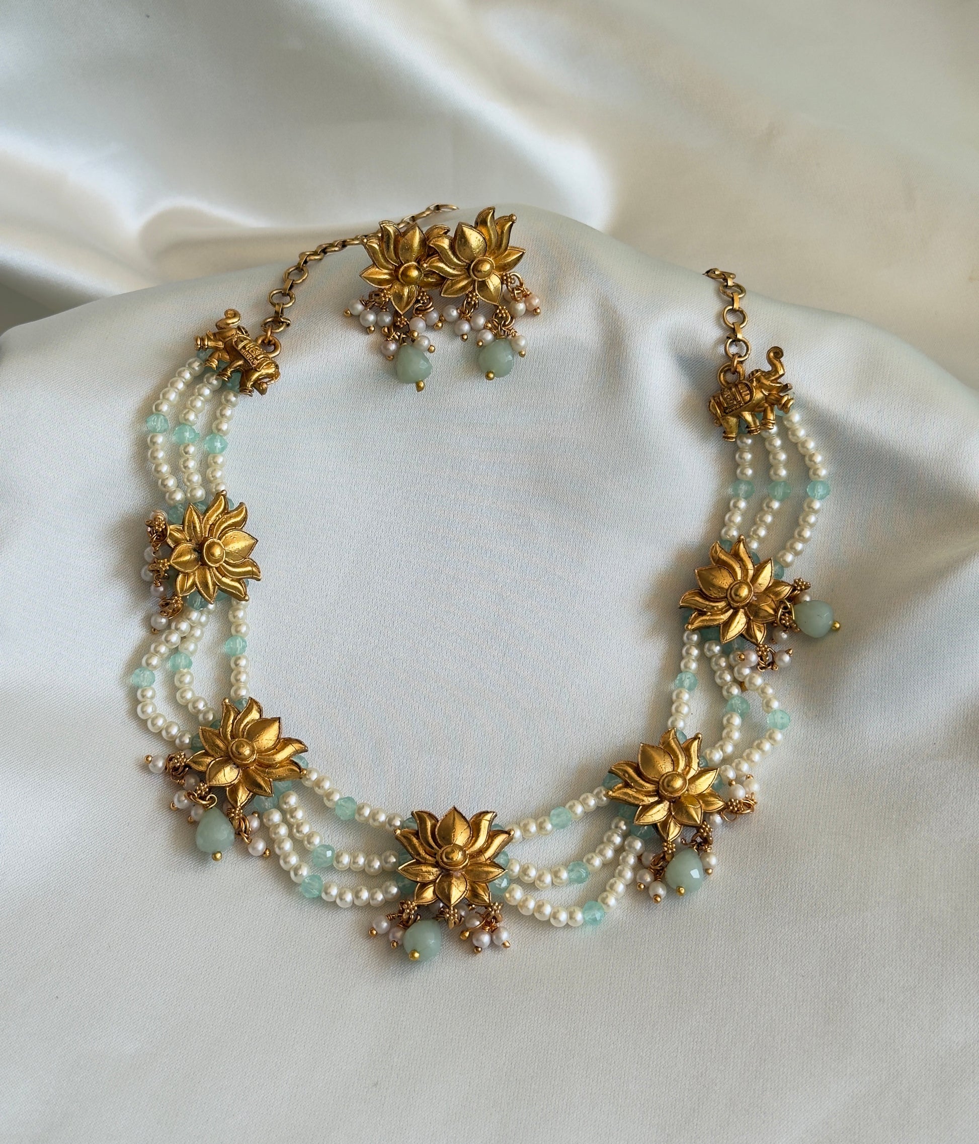 Elevate your style with our Golden Lotus 3 Layer Mint Green Chocker. The intricate design of the golden lotus symbolizes purity and enlightenment. Made with high-quality materials, this chocker adds a touch of elegance to any outfit. Enhance your look and embrace the benefits of a confident, sophisticated style.
