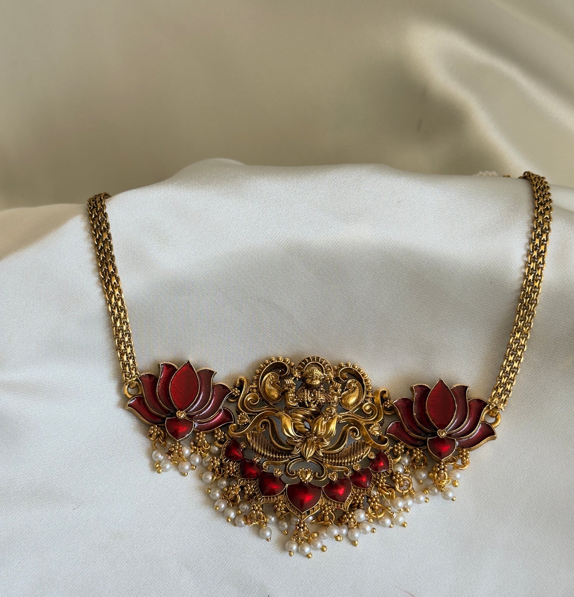 Introducing the stunning Lotus Devi Chocker Red. Made with high-quality materials, this chocker features intricate lotus designs that symbolize purity and spirituality. Perfect for adding a touch of elegance to any outfit. Embrace its calming energy and awaken your inner beauty.
