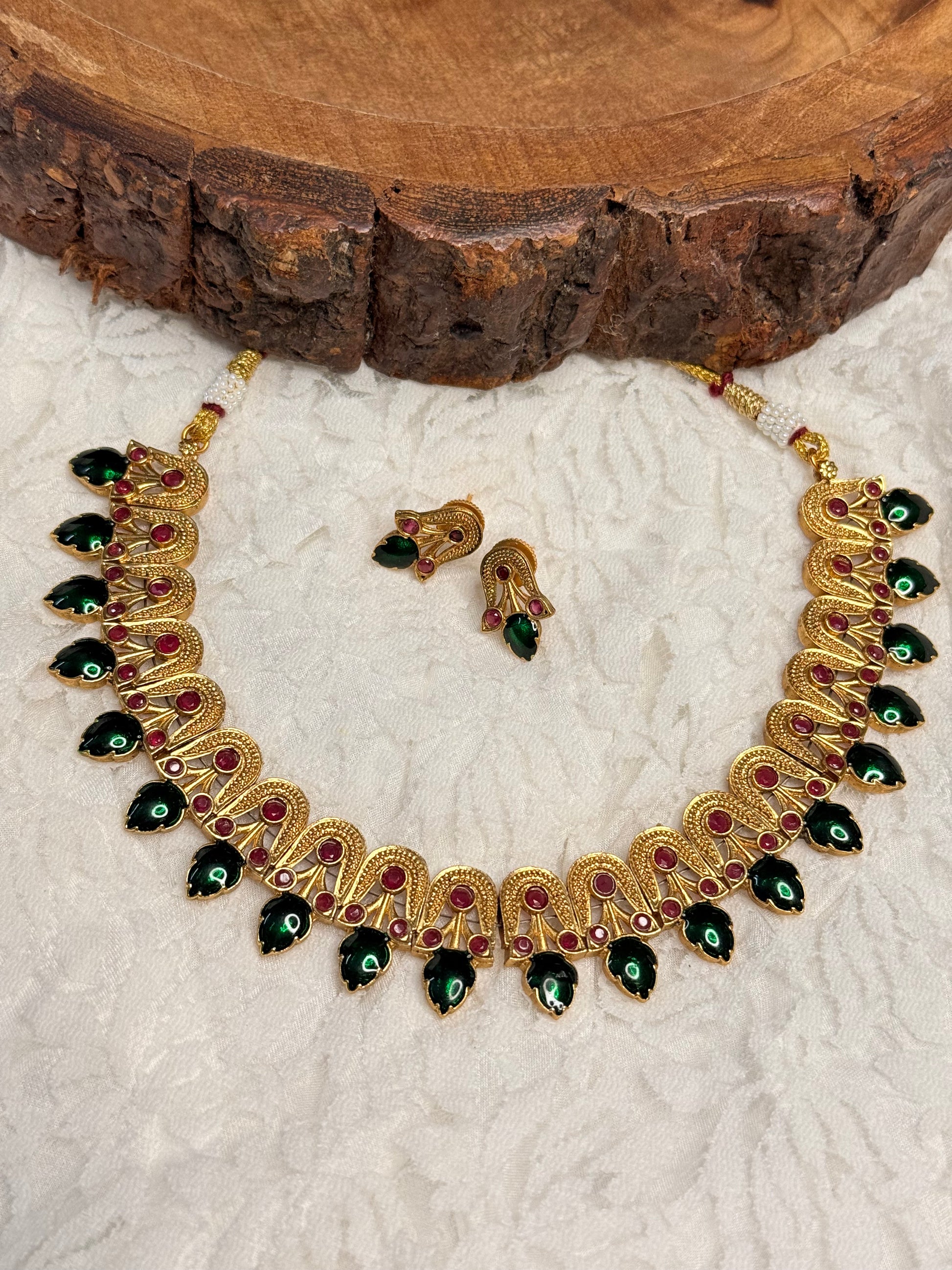 A timeless Palakka necklace set crafted in antique gold finish, featuring alternating ruby and green glass leaf motifs bordered by intricate filigree patterns.
